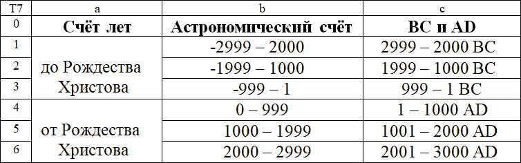 1.30. Пропущенный нулевой год приводит к расхождению между христианской эрой и счётом времени в астрономии. В четырёхлетнем цикле григорианского календаря, когда три года длятся 365 суток каждый, а четвёртый год увеличивается на один день, отсутствие одного года после 1 AD приводит к нарушению счёта високосных лет. Чтобы исправить ситуацию, в 1740 AD французский астроном Жак Кассини обозначил год, предшествующий 1 AD, как нулевой, а ко всем другим годам перед ним добавил знак минус. Например, -100 год равен 100 BC, -2000 означает 2000 BC и так далее. Таким образом, нулевой год, отсутствующий в христианском летоисчислении, стал разделять события до новой эры и после начала новой эры. Этот счет календарных лет назвали астрономическим, он позволяет точно определять високосные годы на больших отрезках времени. До 1 ВС разницы между христианским летоисчислением и астрономическим счётом нет, она появляется начиная с первого года AD.