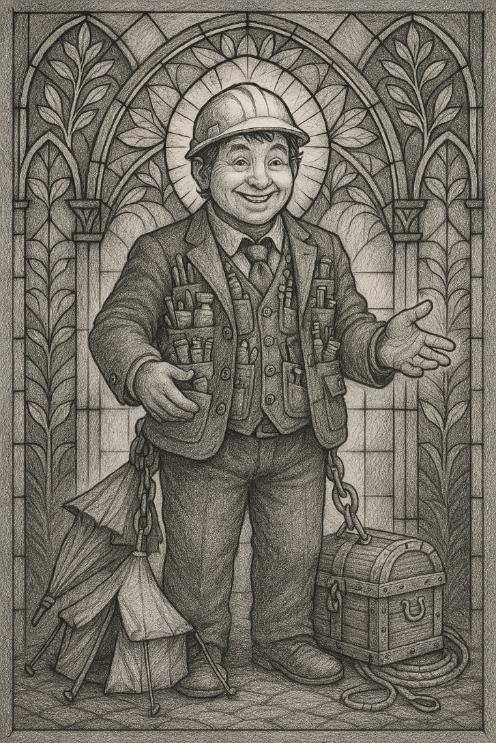 – Друг мой, ты сегодня необычайно весел, не в пример тебе вчерашнему. – обратился из-под строительной каски в сторону собеседника Пстой – бог предусмотрительности. Его пиджак топорщился на толстом коротком теле от множества предметов, которые были напиханы по одному ему известной системе в многочисленные кармашки. Как наружные, так и внутренние. Штаны из зеленой шерсти волочились штанинами по полу, и по полу же за ним волочились привязанные к поясу цепями сундук, зонтик, палатка, лодка и прочие важные для запасливого путешественника вещи. Похоже, что ему это ни капли не мешало и не ограничивало его действия.