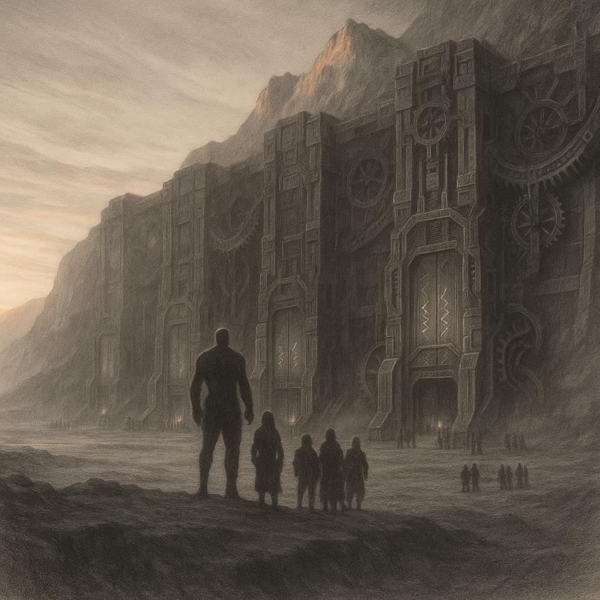 Готовится вместе со своей бригадой зайти в лифт. Перед ними высилась громадина из металла и камня – древний механизм, оставшийся с незапамятных времен. Огромные шестерни, покрытые вековой пылью, глухо скрипели, когда машина оживала. Выделенный на сегодня бригаде один из лифтов, ведущий в глубину шахты, напоминал скорее чудовище, затаившееся в темноте. Его массивные створки были испещрены странными знаками, которые никто уже тысячелетия как не умел читать. Светящиеся линии на корпусе слабо пульсировали, будто железный великан дышал. Творение империи Элу – артефакт давно минувших времен, когда люди летали над землей и совершали много других чудес.