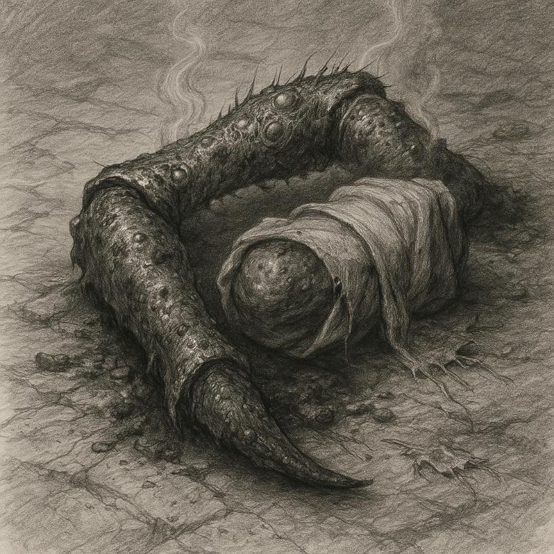 С этими словами он снял с себя шахтерский жилет и накинул его на паренька. Нужен источник тепла. Кругом один пепел и…вот оно! Догорающие останки Черномамки. Аккуратно, чтобы не обжечься, Вормот с трудом отломил сегмент одной из лап паукана. Сойдет за грелку. Он затушил остатки огня на обломке лапы, убедился, что нет тлеющих частей – чтобы не начался огонь – снял с себя рубашку и обернул лапу в нее. Тепла от куска твари хватало.
