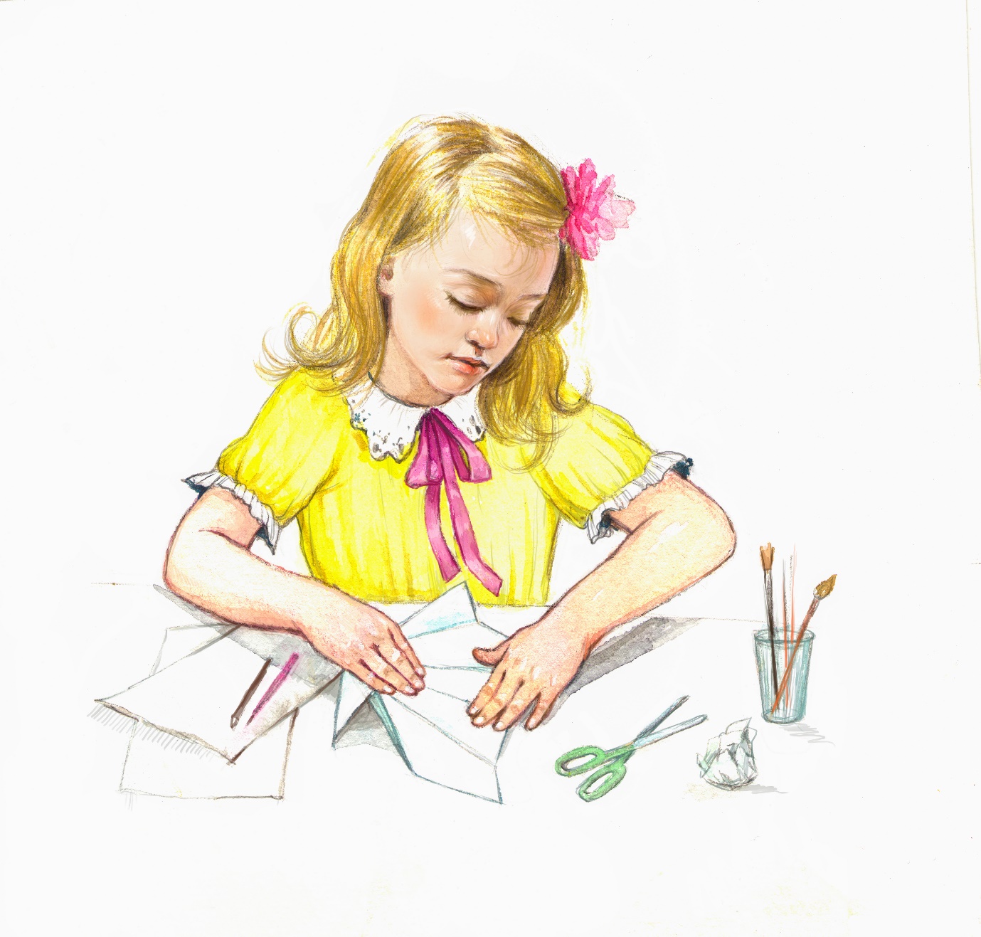 А в это время девочка Лисана, сидя за столом у себя дома и, высунув кончик языка, аккуратно складывала самолетик из квадрата белой бумаги. Закончив, она запустила его в воздух. Сильный сквозняк подхватил легкий самолетик и увлек к балконной двери, а потом и на улицу. Лисана нахмурилась и поджала губы, но, не долго думая, уселась за обеденный стол и принялась складывать новый самолётик.