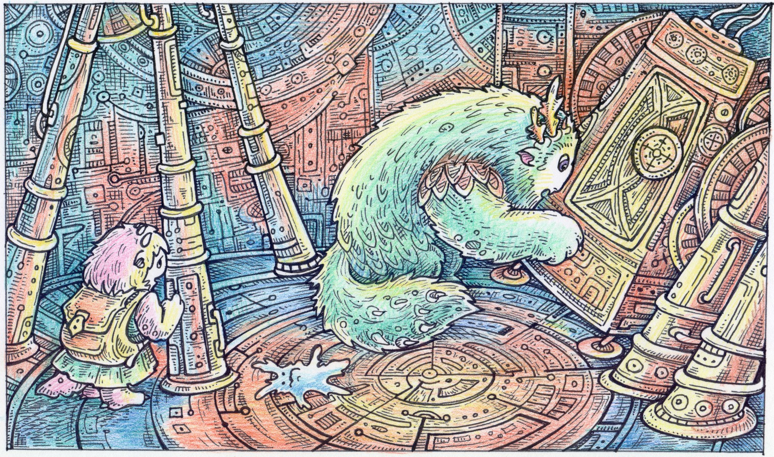 Послышался щелчок, и комнату залило розовым светом. Помещение наполнилось пульсирующим гулом. От неожиданности Грызана вздрогнула и выронила Чувырлика. Возле большой пыхтящей машины, всего в нескольких шагах от Грызаны, стоял папа. Он увлечённо нажимал кнопки и дёргал рычаги, не замечая дочери. Грызана юркнула за стоящий неподалёку шкаф. Пригнувшись и выглядывая одним глазком, она наблюдала. Вот оно! Папа за работой!