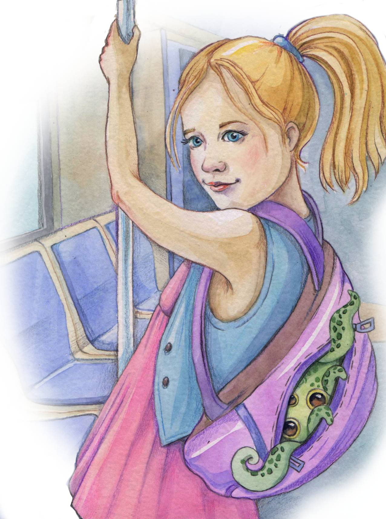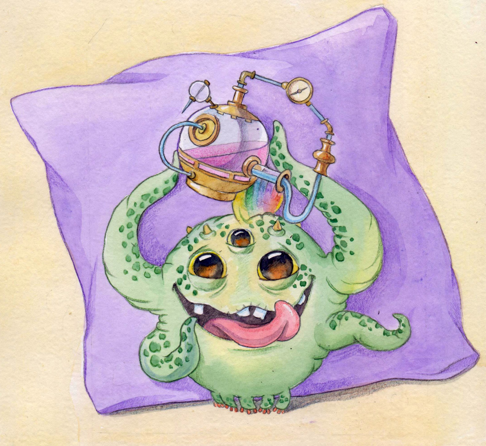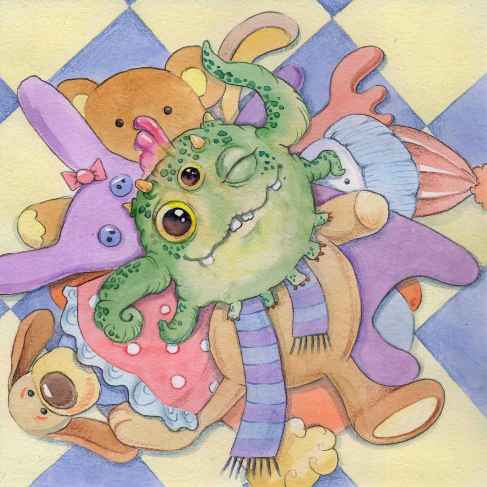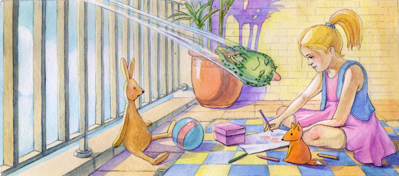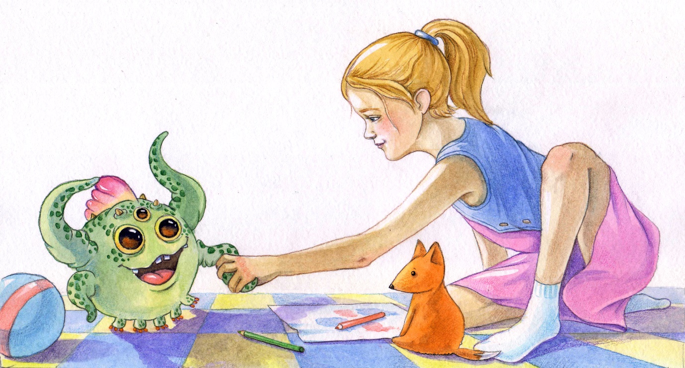 Девочка Лисана сидела на балконе и рисовала. На картинке уже появился страшный монстр, схвативший маленьких человечков, чтобы сделать из них суп, и Лисана готовилась нарисовать супергероя-спасителя, когда услышала сзади какой-то шлепок. Она обернулась и, к своему изумлению, увидала на другом конце балкона очень странное существо. Зеленое округлое тело было размером с арбуз и держалась на 5-и коротеньких ножках. Четыре руки-щупальца торчали в стороны, а под тремя большими глазами расположился широченный улыбающийся рот. Сверху торчал розовый гребень, окруженный коротенькими бугорками-рожками. Лисана сначала подумала, что чья-то несуразная игрушка упала к ней на балкон, но “игрушка” зашевелилась забегала кругами и спряталась за кадку с драценой.