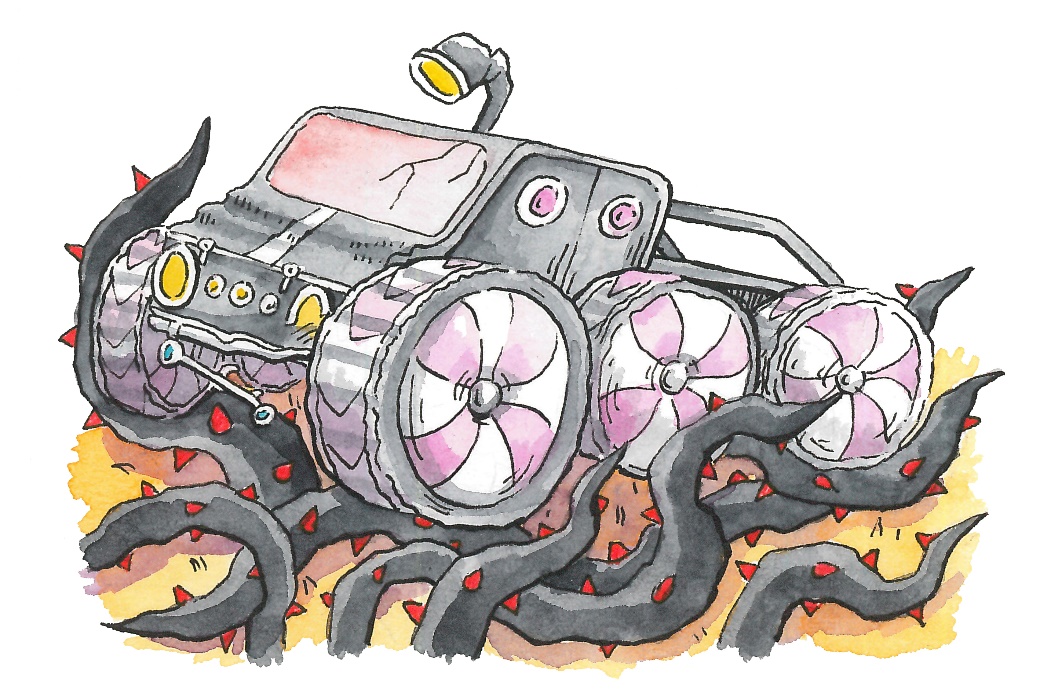 Вездеход так и не починили, и папа Слава с мамой Леной не могли вернуться к себе на корабль. Спать на полу им не хотелось, а потому они вот уже вторую ночь ночевали в изуродованной машине. Обогнув дом, баранозавры и Лисана увидели вездеход, так плотно оплетённый колючками, что открыть дверь стало попросту невозможно.