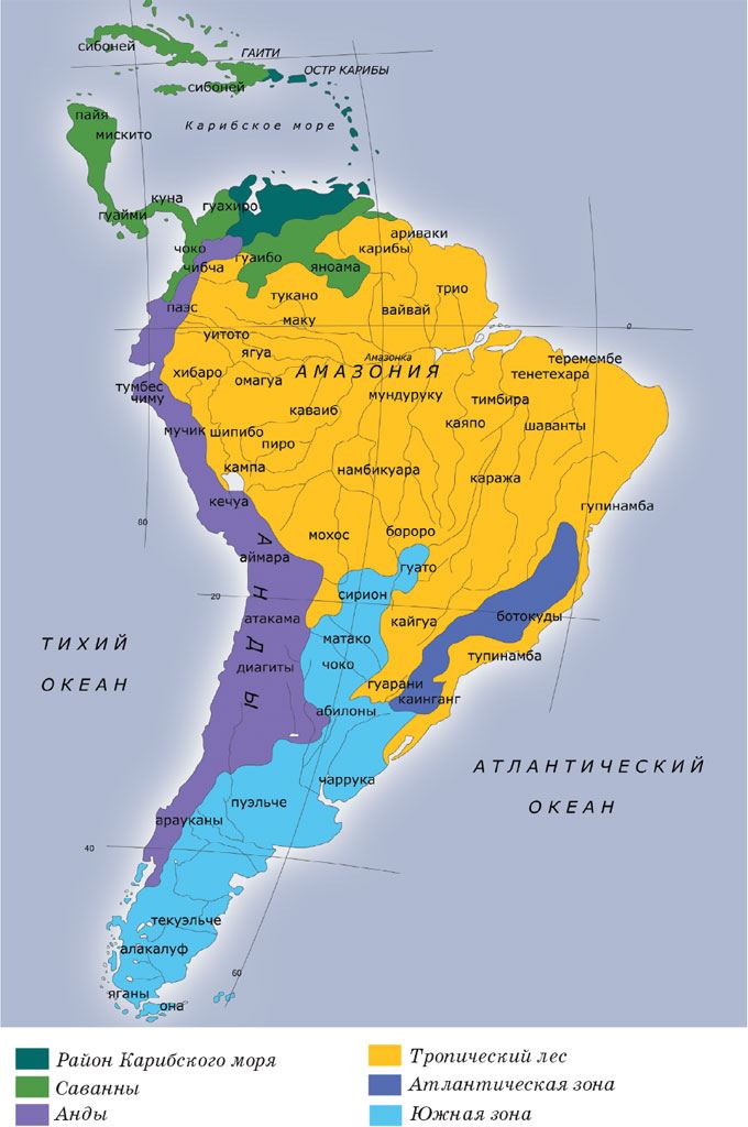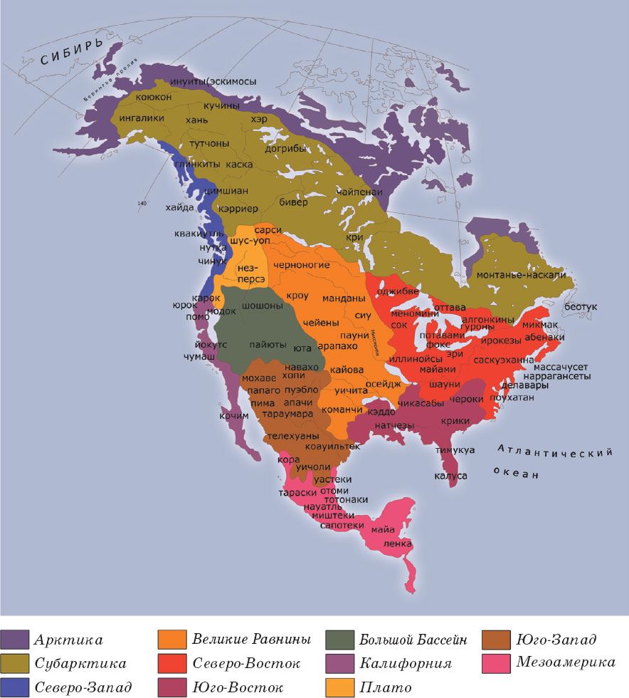 Обусловленная концом Ледникового периода миграция групп древних людей из нынешней Сибири на Американский континент через много тысяч лет привела к образованию индейских племен, расселившихся в Америке так, как это показано на карте