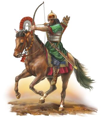 Шлемы у них имели сфероконическую форму – практически такие же использовали и рыцари. Большие круглые щиты древних обтягивались несколькими слоями кожи, а в состав войска входили не только конные лучники, но и копейщики, имевшие шлем, панцирь, круглый щит и копье – весь более поздний рыцарский арсенал!