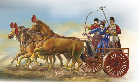 Причем сражались они не только пешими, но и на четырехколесных боевых колесницах, в которые в то далекое время запрягали не лошадей, а ослов. А примерно в это же время жившие в нынешних южнорусских степях племена сумели приручить диких степных коней и научились запрягать их в быстроходные двухколесные колесницы, что давало существенное преимущество в сражениях с пешими воинами противника. О том, что пастушеские племена степного Поволжья использовали лошадь в качестве верхового животного, свидетельствуют остатки конской сбруи, найденные здесь археологами в древних погребениях.