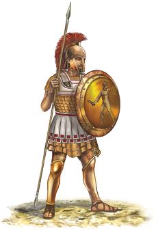 Греческий гоплит конца VI в. до н. э. На нем классический панцирь из медной чешуи на льняной основе, халкидский шлем и гоплитский щит-гоплон