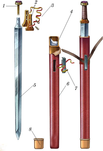 1 – навершие (диск из халцедона); 2 – обкладки рукоятки; 3 – кожаный ремешок; 4 – ножны; 5 – клинок; 6 – кожаная обтяжка; 7 – скоба; 8 – наконечник ножен