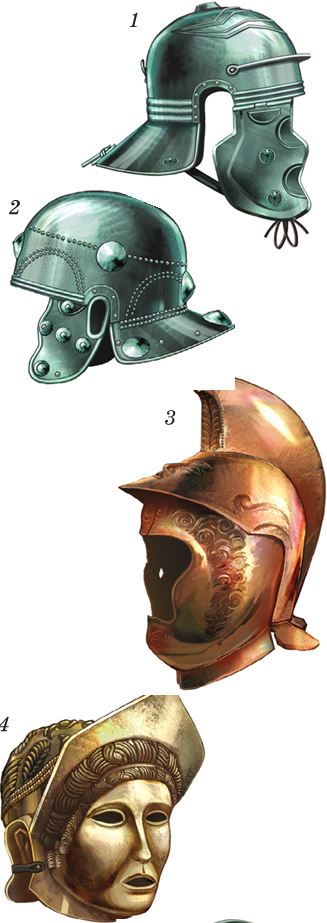 В Древней Греции и вовсе научились производить цельнокованые металлические доспехи из меди и бронзы; на кирасе (так называется состоящий из двух половин панцирь для защиты туловища) рельефно воспроизводилась мускулатура владельца. Шлемы у греков, точно так же как впоследствии и у рыцарей, могли защищать всю голову и лицо и быть цельноковаными, либо состоять из нескольких отдельных подвижных деталей, например, иметь наушники, которые при желании поднимались. Более простые и дешевые доспехи выделывались из склеенных либо сшитых в несколько слоев полос льняной ткани, по форме повторяя доспехи из металла.