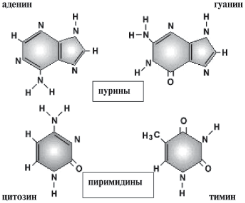 Рис. 1. Структура азотистых оснований (элементарных «букв»), из которых построена молекула ДНК