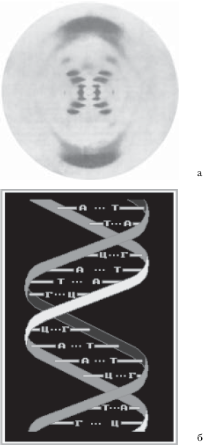 Рис. 4. Знаменитая двойная спираль ДНК а – Рентгенограмма ДНК, полученная Р. Франклин, которая помогла Уотсону и Крику найти ключ к двухспиральной структуре ДНК; б – Схематическое изображение двухспиральной молекулы ДНК