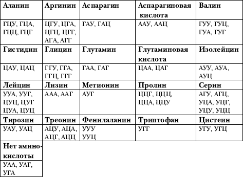 В таблице 1 приведены кодоны, но не в самой ДНК, а в РНК–посреднике (матричной РНК, или мРНК), образующейся на ДНК, и соответствующие им аминокислоты в белках.