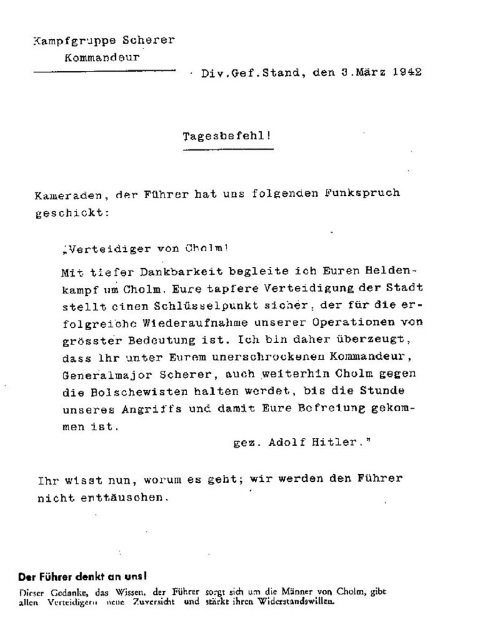 Jason, D. Mark. The Epic Battle for Cholm. Leaping Horseman Books, 2011; Типпельскирх, Курт фон. История Второй мировой войны. 1939–1945. М.: Полигон, 1998; Карелл, П. Дорога в никуда: вермахт и Восточный фронт в 1942 г. Смоленск: Русич, 2003; Гланц, Д. Советское военное чудо 1941–1943. Возрождение Красной армии. М.: Яуза, Эксмо, 2008.