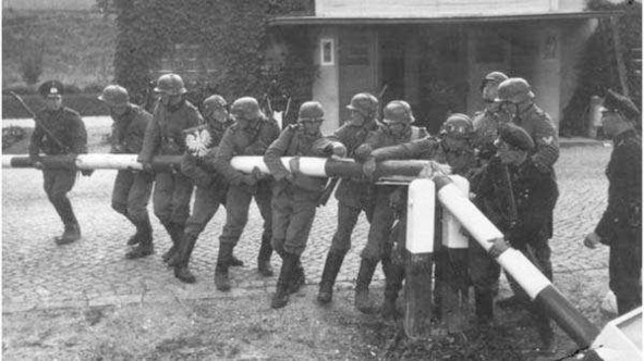 На снимке: Немецкие солдаты сносят шлагбаум на границе Польши и Германии.