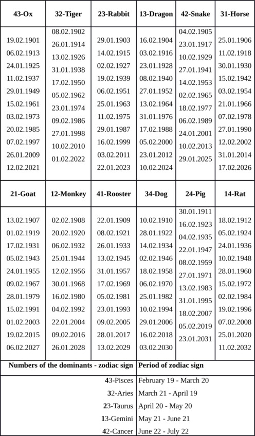 In the Table, for each year of birth, the New Year is indicated according to the Eastern calendar. It falls on the second new moon after the winter solstice (after December 21st). In the Gregorian calendar, this usually corresponds to one of the days between January 20 and February 20.
