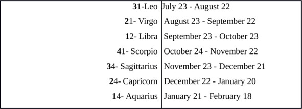The boundaries of the periods of zodiac signs indicated in the Table are not clearly established and depend on the year of birth. For example, in leap years the boundary shifts slightly. On the boundaries of the periods of zodiac signs, the dates are indicated, transitional from one zodiac sign to another zodiac sign.