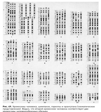 Хромосомы человека, шимпанзе, гориллы и орангутана (схематическое представление). Видно, что второй хромосоме человека соответствует две хромосомы человекообразных обезьян.