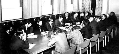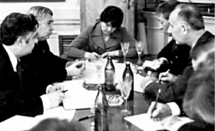 Делегации Норвегии (лицом к нам) и СССР в 1978 г. ведут переговоры по «смежному участку». В центре министр Норвегии по морскому праву и рыболовным границам Е. Евенсен, напротив – министр рыбного хозяйства СССР А. Ишков