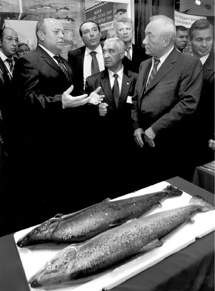 Председатель Правительства России М. Фрадков (на переднем плане слева) знакомится в Мурманске с рыбной экспозицией Северного бассейна. Напротив него губернатор Ю. Евдокимов, в центре – заместитель губернатора В. Зиланов