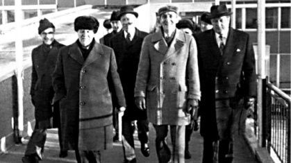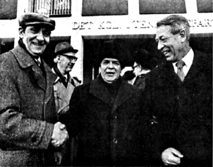 Министр рыбного хозяйства СССР А. Ишков прибыл в Норвегию в январе 1978 г. для завершения переговоров по «смежному участку». Справа от него посол Норвегии в Москве П. Грайвер, рядом с ним министр Е. Евенсен, министр Норвегии по рыболовству Э. Болле и посол СССР в Осло Ю. Кириченко