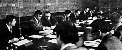 Заседание Смешанной Норвежско-Советской комиссии по рыболовству в Осло в 1978 г. В центре (лицом к нам) начальник Управления внешних сношений и генеральных поставок Минрыбхоза СССР Р. Новочадов и его заместитель В. Зиланов