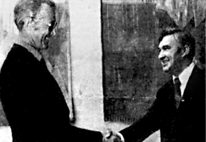 После подписания договоренности по «смежному участку» министр рыбного хозяйства СССР А. Ишков (в центре) поздравляет министра Норвегии Э. Болле и министра Е. Евенсена