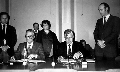 Подписание протокола очередной сессии Смешанной Советско-Норвежской комиссии по рыболовству руководителями делегаций Норвегии – Г. Гундерсеном и делегации СССР В. Зилановым