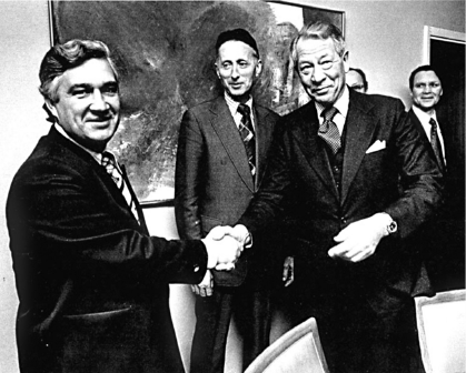 Руководитель норвежской делегации Е. Эвенсон приветствует руководителя советской делегации В. Зиланова перед началом переговоров по проблемам рыболовства в районе Шпицбергена