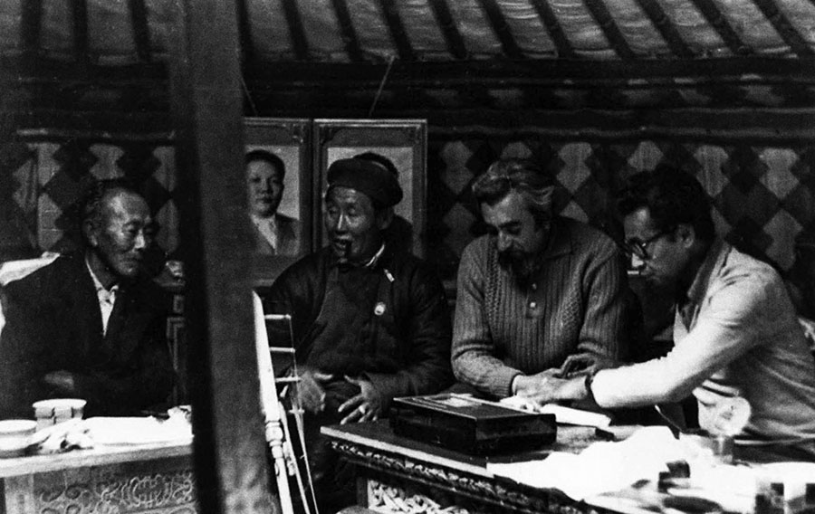 В экспедиции: рабочий момент. Слева – сказители Номунхурд и Сайнулзий. Справа – участник экспедиции Ч. Догсурэн. Среднегобийский аймак, Лус-сомон, 1976 г.