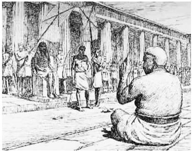Majesteleri, Firavun’un (uzun ömür, varlık ve sıhhat onun olsun) sütunlu salonuna gitti. Dedi ise huzuruna çıkarıldı. Majesteleri sordu: “Nasıl oldu da seni daha önce hiç görmedim?”
