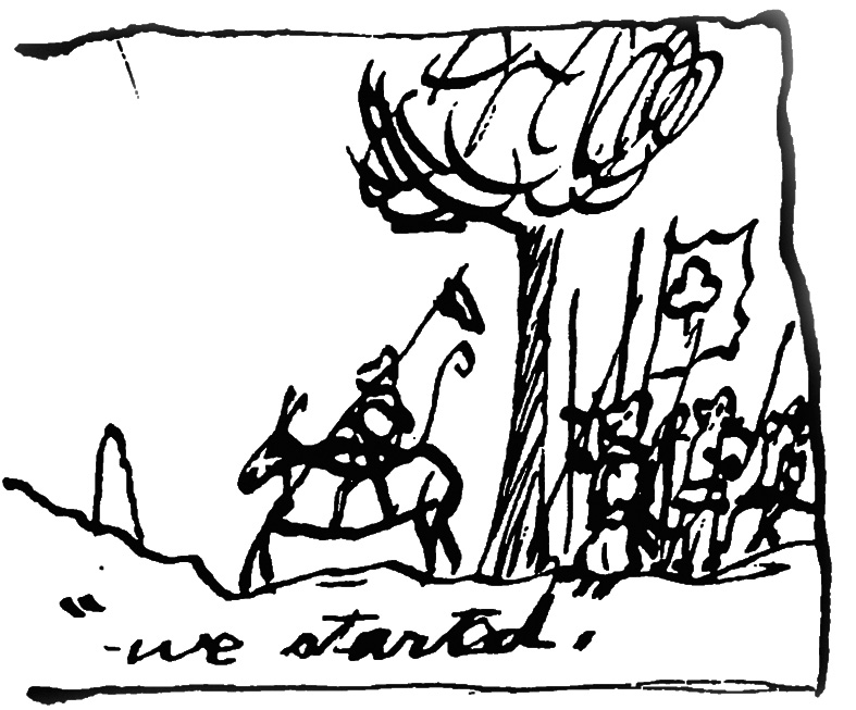 Next morning after an early breakfast we started in the direction of Murry which we sighted in the late evening. It was surrounded completly by the enemyes tents. I realy felt quite thin as we skurried about among these rows of guns and armed men (cats I mean). Once we were chalanged but we pretended to be a cat picket, then we camped in the shadow of a friendly forest.