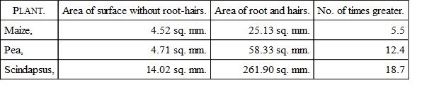 Measurements have shown that in various plants the surface of root on 1 mm. of length is increased by the root-hairs in proportions given in the following table: