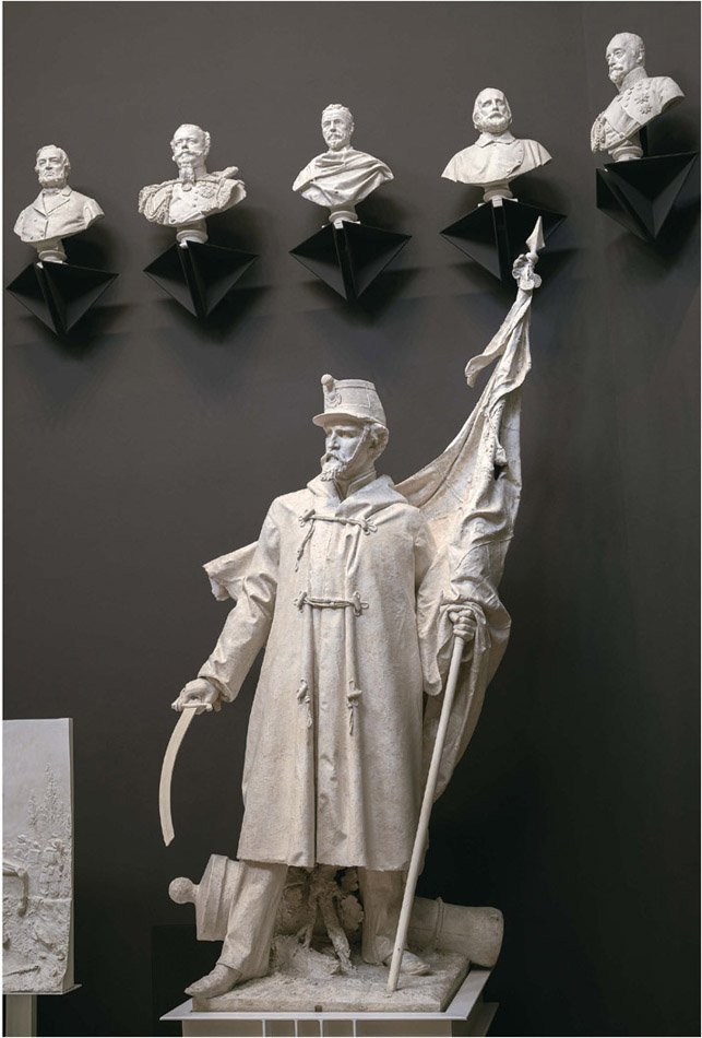 Works by the master were soon followed by those of his pupils and his competitors. In the second half of the century, as many as fifty monuments were erected in Turin alone. It was a unique period, a golden era for sculptors, during which art and politics entered into strict symbiosis. This is exemplified by Vela’s Flag-Bearer (1857–1859, I, ill. p. 11, plinth relief see ill. p. 48) located in Piazza Castello, opposite Palazzo Madama, which actually functions as a manifesto. Donated by Milanese exiles to express their thanks to the Sardinian army for their assistance in 1848 during the first campaign against Austria, in 1859 the newly-inaugurated monument spurred the army that was once again marching against the enemy to unite Italy. Meanwhile, in Lombardy, the adversaries swore that the Flag-Bearer would be the first statue to be knocked off its pedestal when they entered the Piedmont capital.