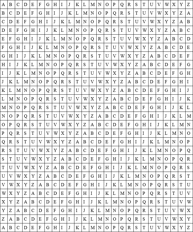 Stone took a large sheet of paper, and wrote the alphabet straight across its top. He then wrote the alphabet straight down the left hand side. He then filled in the letters in their correct rotation until he had this result