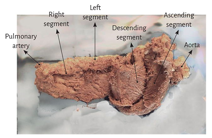 Regarding the argued difficulty to dissect the myocardium, which is more apparent than real (128), we should consider that once the myocardial band originated as a loop in the arterial semicircle of amphibians and reptiles to adapt to the physiological demands of aerial life, the muscle bundles became firmly attached to their contact surfaces, hampering the necessary cleavage planes necessary for their anatomical dissection. The evolutionary goal was to develop a sufficiently solid hemodynamic structure with the strength to generate the suction and pumping of the blood volume that supplied the whole organism. Thus, every attempt to dissect an anatomical segment from the rest of the myocardium, avoiding the real cardiac arrangement, always turns into an obstacle due to the structural plan of the axes where the orientation of the myocardial band courses.