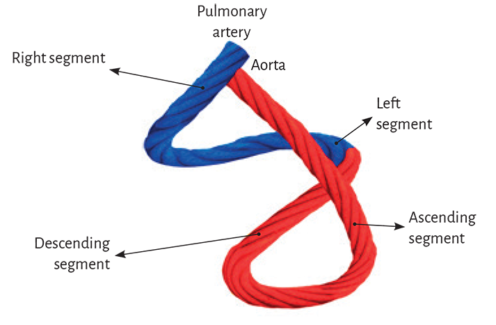 Figure 1.4. Rope model of the myocardial band. It illustrates the different segments that form the band. In blue: Basal loop. In red: Apical loop.