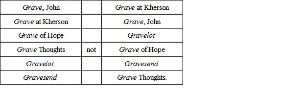 The perfect alphabetical arrangement is often ignored, and it is not always easy to decide as to what is the best order; but the above rule seems to put the matter pretty clearly. If no system is adhered to, it becomes very difficult to steer a course through the confusion. When such entries are printed, a very incongruous appearance often results from the use of a line to indicate repetition when a word similar in spelling, but not really the same word, occurs; thus, in the above, Grave surname, Grave substantive, and Grave adjective must all be repeated. It is inattention to this obvious fact that has caused such ludicrous blunders as the following: