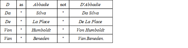 A prefix which is translated into the relative term in a foreign language cannot be considered as a fixed portion of the name. Thus Alexander von Humboldt, when away from his native Germany, translated his name into Alexandre de Humboldt. The reason why prefixes are retained in English names is because they have no meaning in themselves, and cannot be translated. There is a difficulty here in respect to certain names with De before them; for instance, the Rothschilds call themselves De Rothschild, but when the head of the family in England was made a peer of the United Kingdom he became Lord Rothschild without the De. In fact, we have to come to the conclusion that when men think of making changes in their names they pay very little attention to the difficulties they are forging for the cataloguer and the indexer.