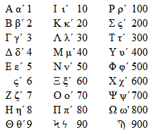 More difficult than chronograms are Greek dates, because each letter in Greek has a numerical value, and the numbers do not follow in an uninterrupted series, because certain additional figures are introduced. It is therefore often necessary in cataloguing Greek books to refer to a table such as the following:—