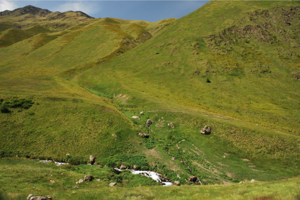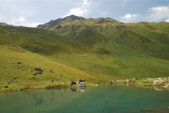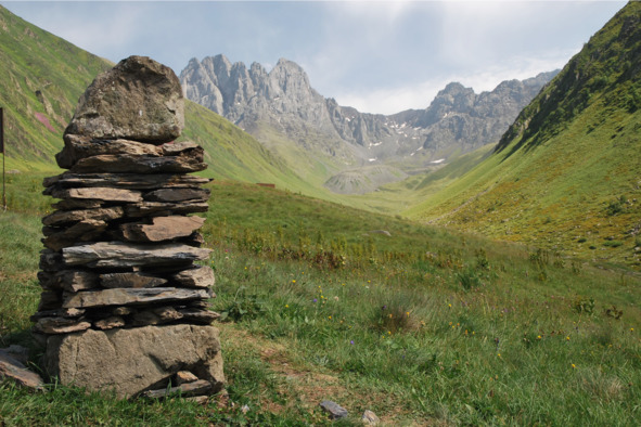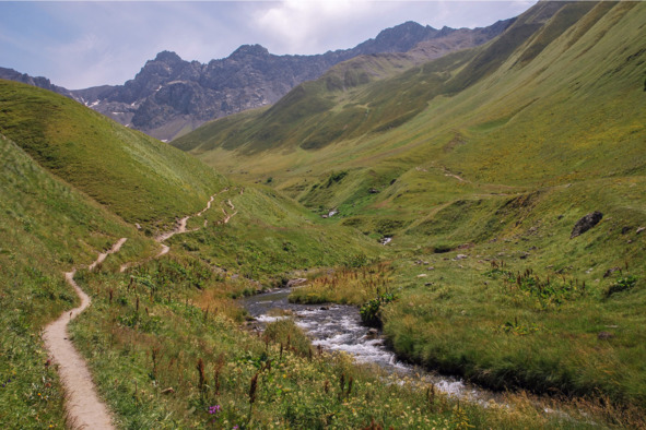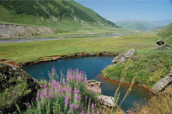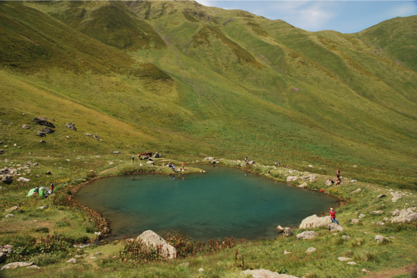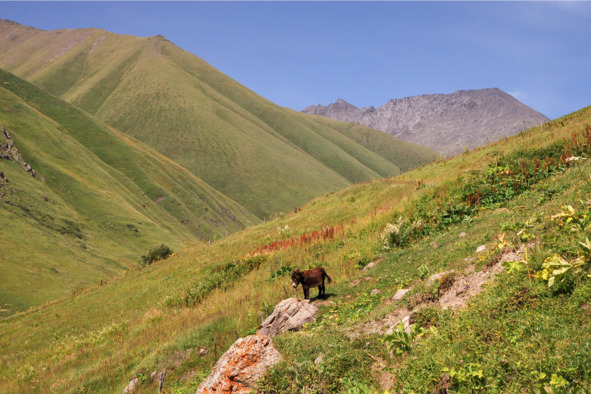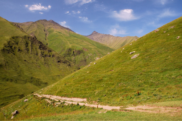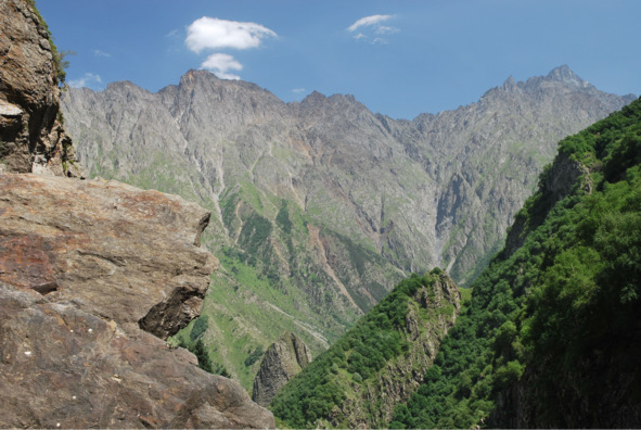 С самого утра нас ждет прогулка в ущелье Джута (Juta). Идти километров семь, практически по равнинной местности с превышением в тысячу метров. Но это все мелочи по сравнению с тем, что попасть на плоскогорье можно лишь одним способом. От одноименного села, куда нас забрасывает Алекси на своем минивэне Delica Mitsubishi, нужно подняться по горной тропе, уходящей круто вверх под восемьдесят градусов. До ровного участка взбираться метров пятьсот, но после выпитого накануне они превращаются в вечность. Голова гудит, отзываясь тупой болью при каждом шаге, вот-вот взорвется. Хороший урок. Здоровье все же дороже мнимого удовольствия. Одна отрада – уже там, на возвышенности, есть небольшое кафе с видом на ущелье и горную гряду. Нужно только взять чашечку кофе, выйти на свежий воздух, подыскать себе пуфик, гамак или удобный камешек, усесться и, вдыхая ароматы наступающего дня, насладиться терпким напитком. И лишь после этого совершить неспешный марш-бросок к подножию седловидного перевала Чаухи (Chaukhi).