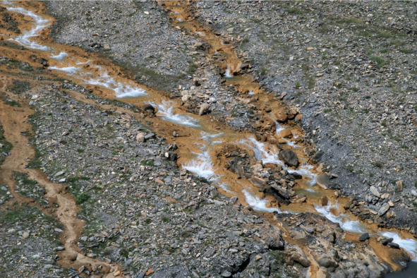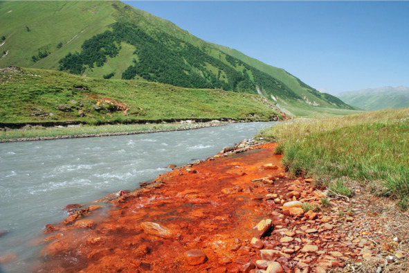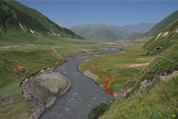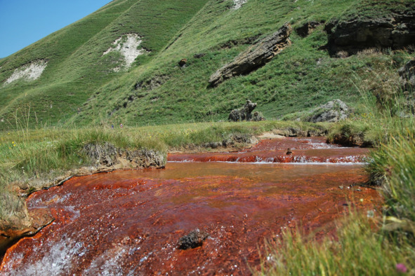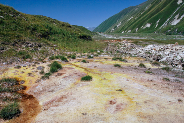 В долине картина меняется, русло Терека множится, образуя запруды и отдельные речушки ржаво-красного цвета. Фантасмагорическая картина словно снимок из космоса. Наш путь лежит к озеру Абано (Abano), хотя в действительности это небольшая, метров в пять в диаметре, бездонная лужа с вьюнами пузырьков, непрерывно поднимающихся из ее недр.