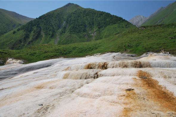 Вода кристально чистая, питьевая и с привкусом железа, но из-за толщи воды разглядеть кратер озера можно не больше чем на метр-два. Длинные нити белесых бурунов, разрезающих лазурную гладь, превосходно смотрятся со склона горы. Как и вид на округу с «кровавыми», стелящимися по земле, рукавами, вырвавшимися из подземных источников. Неповторимая игра цвета: темно-синее озеро с огненно-рыжим руслом, устремленным к темно-серым водам Терека. Зеленый ковер с россыпью горных цветов и желто-белые с ржавыми прожилками террасы миниатюрной копии турецкого Памуккале.