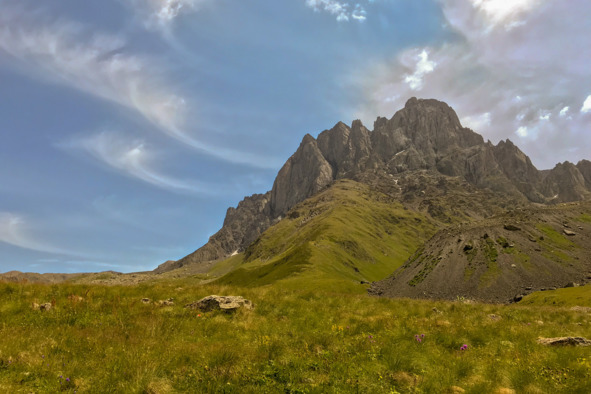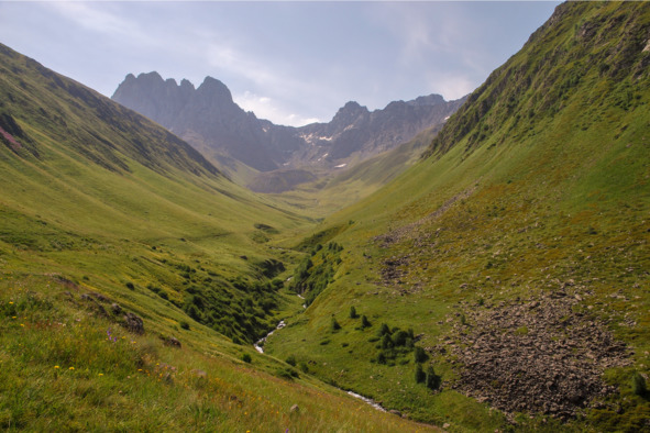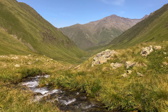 Обратно возвращаемся той же тропой, только речушку переходим в другом месте, чуть ниже, где валун в воде лежит. Как раз посреди русла. Хоть какое-то подспорье, только прыгать все равно нужно. Как ни крути, но риск все же есть. Так что, возможно, правая тропа безопаснее будет. А так виды в ущелье потрясающие, особенно на фоне василькового неба с небольшими белыми облаками-завитушками. Да и с погодой нам повезло. Ни жарко, ни холодно, ни дождя обещанного.
