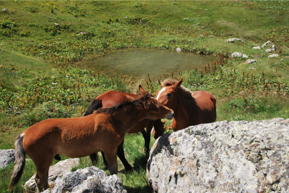 Тропа хорошая, утоптанная, вдоль речушки стелется, местами ее пересекает, оттого часто разветвляется: можно вброд идти, можно зигзаги воды повторять. Все едино, конечная точка одна: синее блюдце небольшого озерца, откуда до перевала рукой подать. А за ним Абуделаурские цветные озера и деревушка Рошка (Roshka), куда нам предстоит отправиться на следующий день. А пока берем левее и через пару километров упираемся в нагромождение огромных камней, под которыми, шипя и извиваясь, клокочет стремнина. Ни деревянного настила, ни выбоин на камнях для зацепки. Лишь сноровка да смекалка. Не скажу, что особо сложно, но приятного мало.