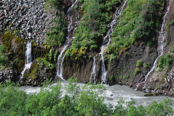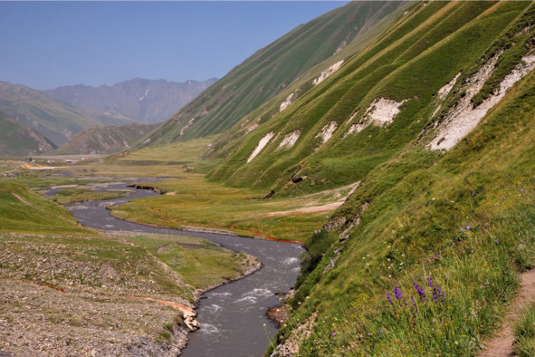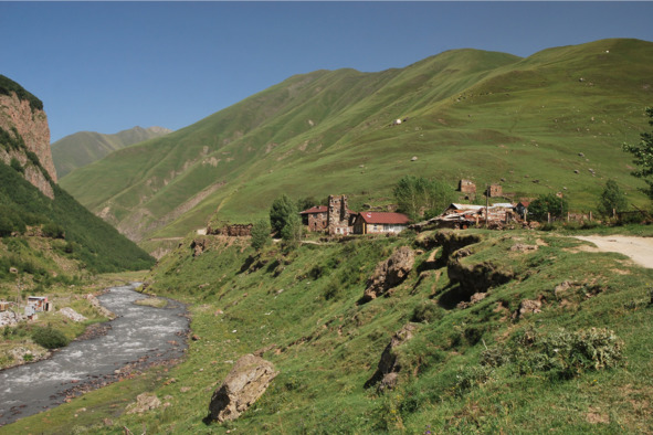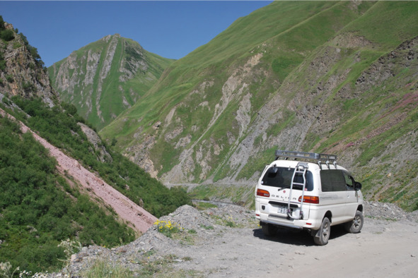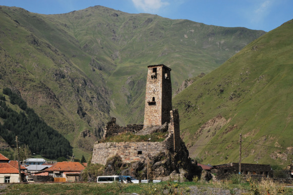 На следующий день после сытного завтрака под присмотром заснеженного Казбека, взирающего на округу в нахлобученной на макушку шапочке-облаке, довлея над зелеными вершинами, мы отправились в местечко Шевардени (Shevardeni), где начинается ущелье Трусо (Truso). За мостом, огибая развалины родовой осетинской башни, начинается серпантин, который устремляется в гору, повторяя изгибы бурного Терека. Постепенно ущелье сужается. Лента дороги вьется над пропастью. Справа неровными скальными выступами давят горы, а слева в низине бьется и скачет по камням непокорная река. Навстречу ей по отвесным склонам, сползая плющом, спешат гроздья водопадов, с разгона врезая свои воды в бурный поток. Еще несколько опасных поворотов и горы расступаются.