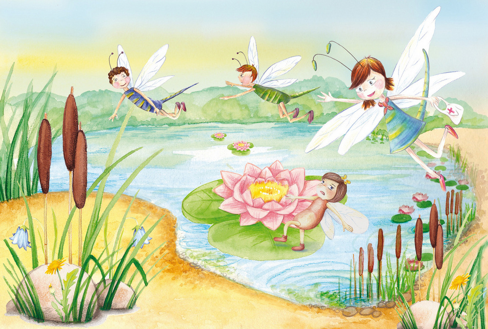 Лилли подбирает муху своими ножками и летит с нею на лист кувшинки. Муха стряхивает капли воды и облегчённо говорит: «О, это было так здорово, маленькая стрекоза, что ты помогла мне. Как тебя зовут?»