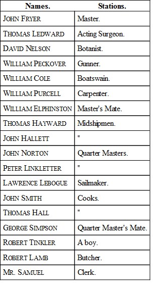 The armourer, Joseph Coleman, and the two carpenters, M'Intosh and Norman, were also kept contrary to their inclination; and they begged of me, after I was astern in the boat, to remember that they declared they had no hand in the transaction. Michael Byrne, I am told, likewise wanted to leave the ship.