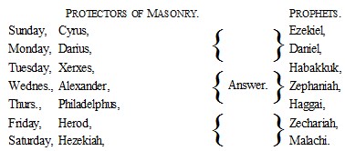 Charge Addressed to the Candidate.—My dear brother:—The Saracens having taken possession of the Holy Land, those who were engaged in the Crusades not being able to expel them, agreed with Godfrey de Bouillon, the conductor and chief of the Crusaders, to veil the mysteries of religion under emblems, by which they would be able to maintain the devotion of the soldier, and protect themselves from the incursion of those who were their enemies, after the example of the Scriptures, the style of which is figurative. Those zealous brethren chose Solomon's temple for their model. This building has strong allusions to the Christian church. Since that period they (Masons) have been known by the name of Master Architect; and they have employed themselves in improving the law of that admirable Master. From hence it appears that the mysteries of the craft are the mysteries of religion. Those brethren were careful not to entrust this important secret to any whose discretion they had not proved. For this reason they invented different degrees to try those who entered among them; and only gave them symbolical secrets, without explanation, to prevent treachery, and to make themselves known only to each other. For this purpose it was resolved to use different signs, words, and tokens, in every degree, by which they would be secured against cowans and Saracens. The different degrees were fixed first to the number of seven by the example of the Grand Architect of the Universe, who built all things in six days and rested on the seventh. This is distinguished by seven points of reception in the Master's degrees. Enoch employed six days to construct the arches, and on the seventh, having deposited the secret treasure in the lowest arch, was translated to the abodes of the blessed. Solomon employed six years in constructing his temple; and celebrated its dedication on the seventh, with all the solemnity worthy of the divinity himself. This sacred edifice we choose to make the basis of figurative Masonry. In the first degree are three symbols to be applied. First, the first of the creation, which was only chaos, is figured by the candidate's coming out of the black chamber, neither naked nor clothed, deprived, etc.; and his suffering the painful trial at his reception, etc. The candidate sees nothing before he is brought to light; and his powers of imagination relative to what he has to go through are suspended, which alludes to the figure of the creation of that vast luminous body confused among the other parts of creation before it was extracted from darkness and fixed by the Almighty fiat. Secondly, the candidate approaches the footstool of the Master, and there renounces all cowans; he promises to subdue his passions, by which means he is united to virtue, and by his regularity of life, demonstrates what he proposes. This is figured to him by the steps that he takes in approaching the altar; the symbolic meaning of which is the separation of the firmament from the earth and water on the second day of creation. (The charge proceeds by giving a figurative interpretation of the ceremonies, etc., of the first and second part of the third degree, which I pass over as uninteresting to my readers, and commence with an interpretation which will be as novel to the Craft of the lower grades as to the cowans, or non-initiated.)
