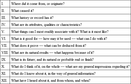 SYSTEM OF ANALYSISWhen you wish to discover what you really know regarding a thing, ask yourself the following questions about it, examining each point in detail, and endeavoring to bring before the mind your full knowledge regarding that particular point. Fill in the deficiencies by reading some good work of reference, an encyclopedia for instance; or consulting a good dictionary, or both:
